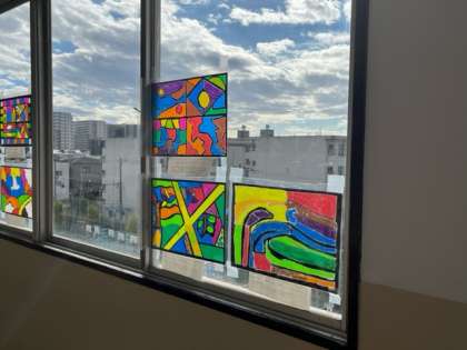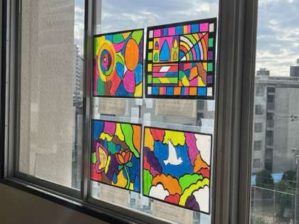 2年生の美術で作成したステンドグラスが廊下に飾られています。