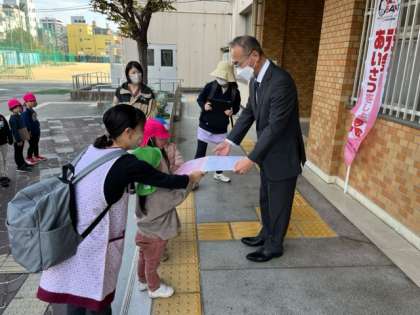 お隣のソフィア保育園の園児たちが、勤労感謝の日を前に手作りの贈り物を校長先生に渡すため、中学校に来ました。