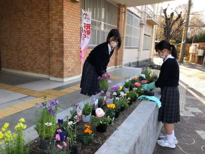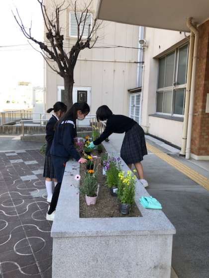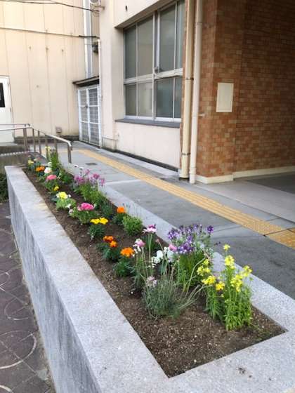 家庭科部の生徒が学校正面入り口の花壇を整備してくれました。