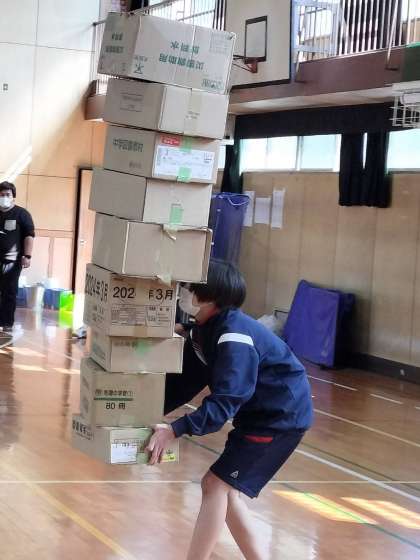 一つめの競技は「新・箱運び競争」。9つの箱を高く積み上げて運びます。最初は4人ですが、片道ずつで運び手がひとりずつ減っていきます。