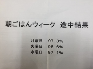 先週の金曜日に朝ごはんウィ—ク周知についての内容を掲載しました。毎日の摂取を%で集計しました。詳しい結果発表は終了後に載せますが、とりあえず中間で経過発表をします。3日間を過ぎましたが、結果は月曜日は97.3%で一番良い結果でした。さらに11日に向けて、しっかり朝ごはんを取る習慣を身につけましょう。