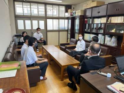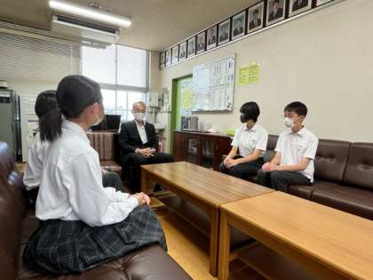 生徒会のメンバーが校長室で校長先生と今後の取り組みについて話し合っています。