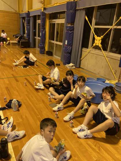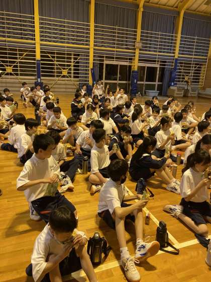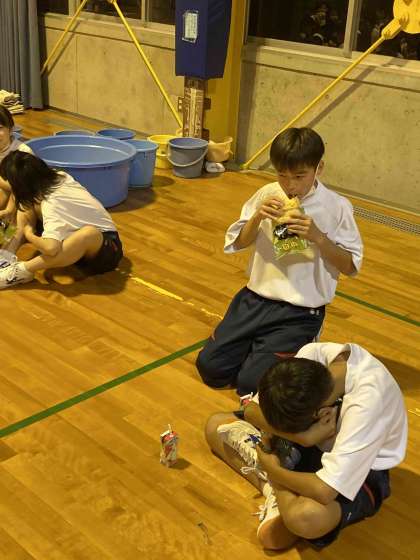 楽しかった室内レクリエーションも終わり、少しお腹も空いているので、メロンパンとアップルジュースの補食をとっています。