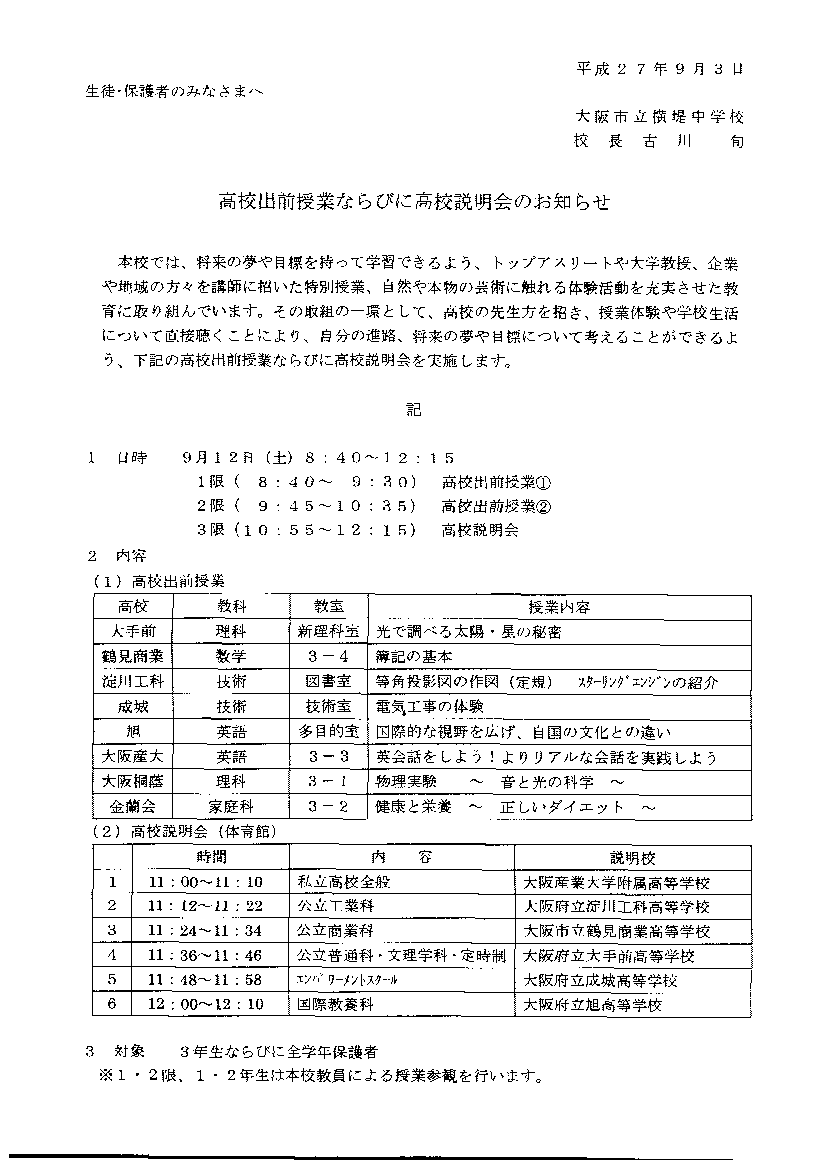 高校出前授業並びに高校説明会のお知らせ
