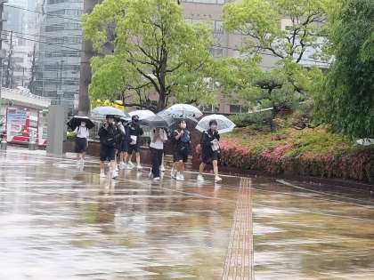 あいにくの雨ですが、各班で電車を乗り継いで、目的の場所に到着し始めています