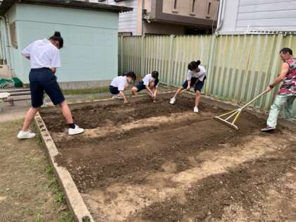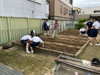 家庭科部が菜園のための畑を耕しています。