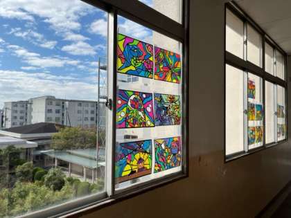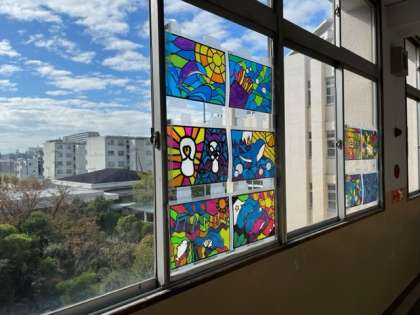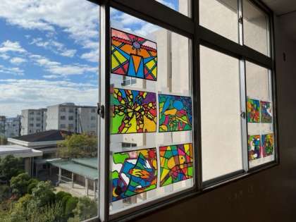 美術の作品が図書室前の廊下に展示されています。太陽の光を浴びて更に美しくみえます。