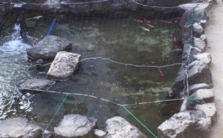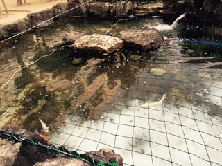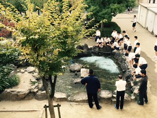 池がきれいになりました。水が白く濁っているのは、薬液です。お腹に虫を持っている鯉がいてるようで、治療です。生徒も鯉が元気を取り戻すよう、毎日見守っています。