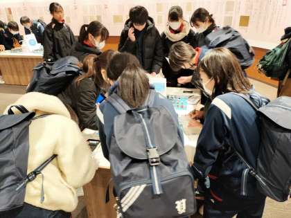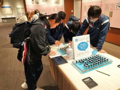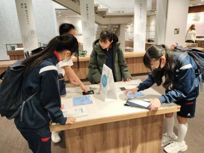 漢字ミュージアムにも午前の部の生徒が全員到着しました。万葉仮名や「もとの字」スタンプで自分の名前を作っています