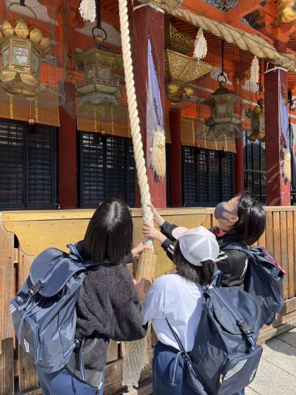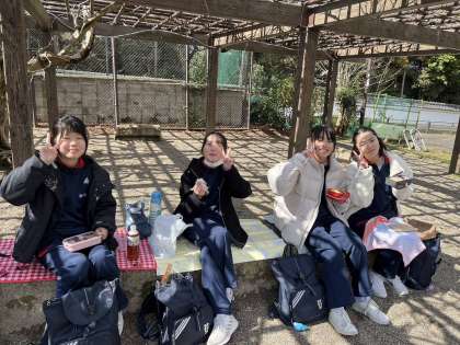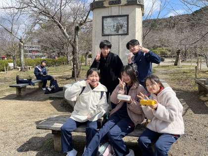 八坂神社、円山公園で昼食をとってる班も多いです。予報と違い、ポカポカのいいお天気です