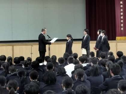 続いての全校集会では卓球部への賞状の伝達が行われました。