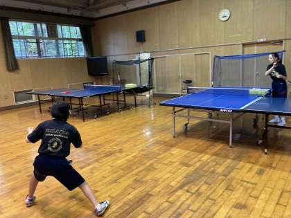 卓球台を2台つなげて、多球練習を行っています。
