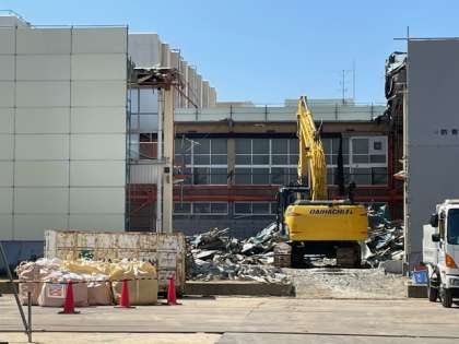 とうとう体育館の屋根、外壁の撤去が進んでいます。
