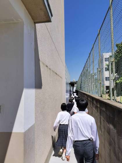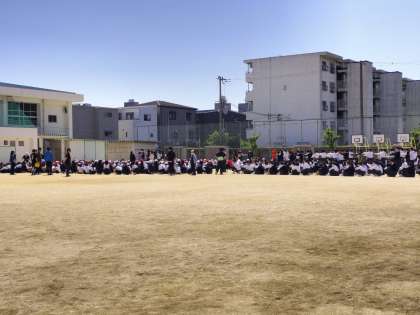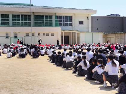 中学校の全生徒が小学校の運動場に避難し、小学生、中学生、教職員合わせて1000人近くが集合しました。学校長からは「中学生のみんなは自分の命を守ることはもちろんですが、弱い立場の人たちを守る、助ける側の人であることを忘れないでほしい。そのことを目の前に実際に小学生がいることで実感してほしい。また、小学生は中学生のお兄ちゃん、お姉ちゃんが何かあったら助けてくれる。だから安心できるということを実感してほしい。」というお話がありました。小学校の校長先生からのお話の後、中学生は中学校に戻りました。6限終了後下校します。