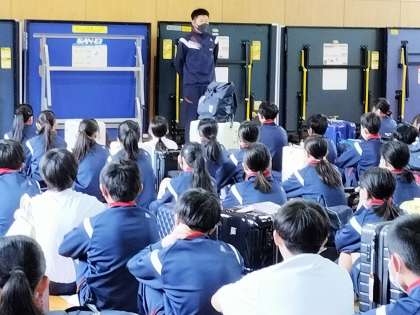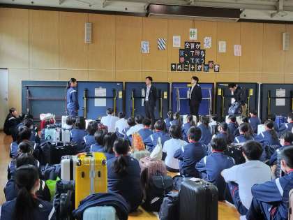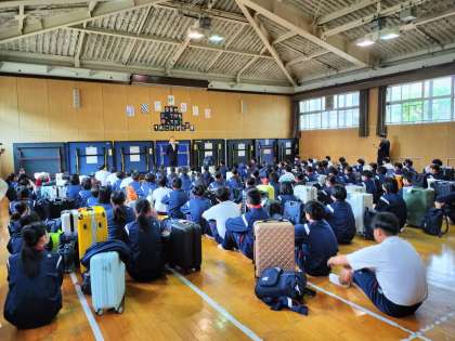 おはようございます。3年生は格技室で生徒主導で出発式を行っています。