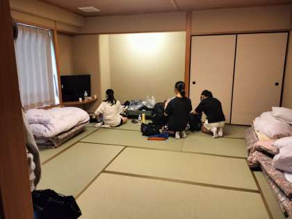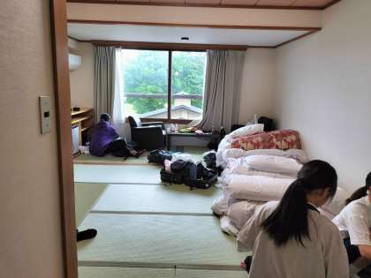 朝食後にマウンテンバイク決行の連絡がされると、歓声が上がっていました。今は8時15分の出発に向けて慌ただしく準備中です。