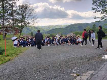 荷物をクラスのバスに積み込んだ後、とんぼ玉、陶芸、そば打ちの体験毎に並び直します。風はだいぶ弱まりました。