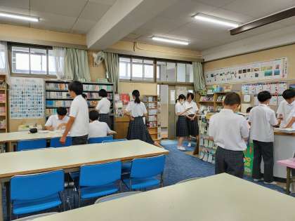 朝からの大雨で運動場が使えなかったこともあり、今日の昼休みは来館者が多かったです。入口にある回転式の書架は人気の作品が多いこともあり、クルクル廻しながら本を探す姿をよく見かけます。