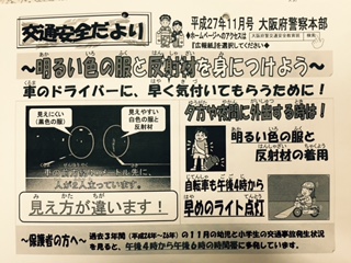 ずいぶん寒くなり本格的な寒さの到来です。早くに暗くなり、帰宅を急ぐこともしばしば。ただ、今年の交通事故件数は増加しています。下校時間帯の4時から6時の事故発生率が高いので、帰宅時特に注意が必要です。気をつけましょう。