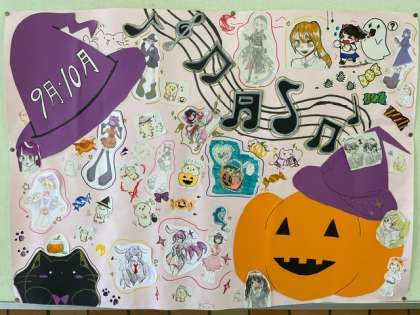 玄関の掲示板に文芸部が作成してくれた9・10月のポスターが掲示されています。