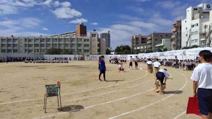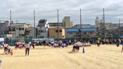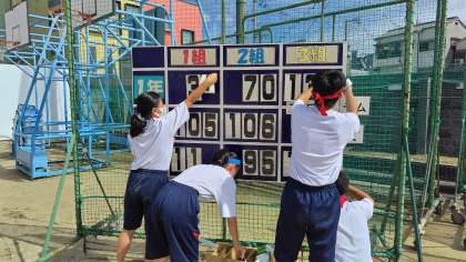 写真は、プログラム6番1年学年種目と、プログラム7番バラエティ走と、得点板係の様子です。