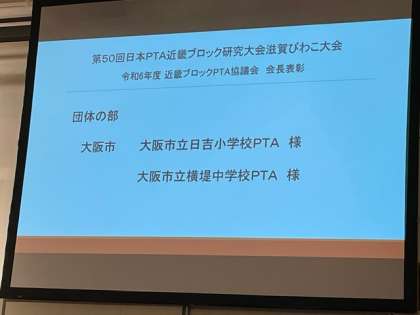 本日、PTA近畿ブロック研究大会が滋賀県で行われました。この大会の席上、横堤中学校PTAが優良団体として表彰されました。本当におめでとうございます。