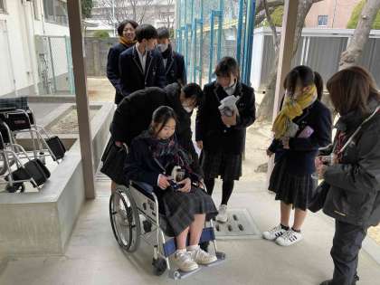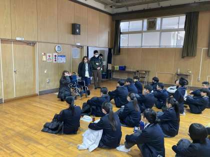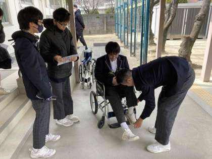 1時間は車いす体験、もう1時間は弱視体験と難聴体験に分かれて体験活動をしました。