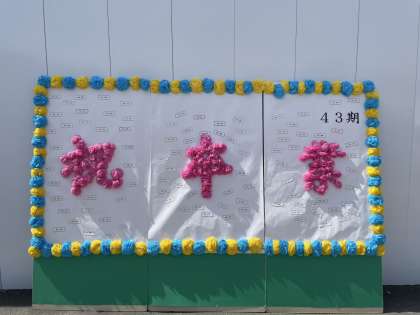 在校生が作ってくれた花文字やPTAの皆さんが真心込めて作ってくださったフォトスポットの前で撮っています。