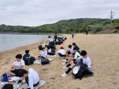 砂浜でレジャーシートを広げて食べ始めました