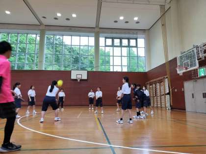最初は円陣トスからです。どのグループが一番長く続けられるか競っています。