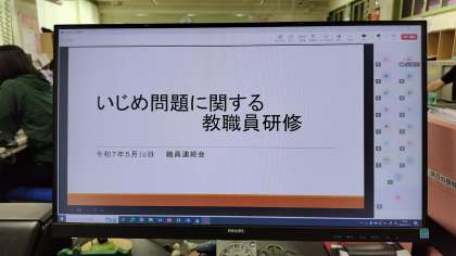本日(5月16日)、5月職員連絡会において、PowerPointのスライドを使用して、「いじめ問題に関する教職員研修」を実施しました。教職員はTeamsの画面に向かって、熱心に研修に取り組んでいました。