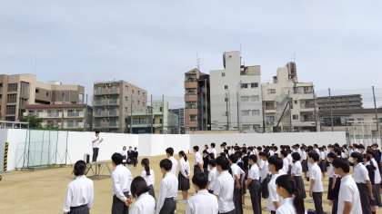 本日(5月19日)、青空の下、グラウンド朝の全校集会を実施しました。工事の仮囲いも2学期にはなくなります。