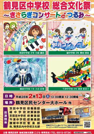 鶴見区内5つの中学校の合同文化祭で、音楽部や吹奏楽部による熱気あふれるコンサートや、文化部の様々な作品展示をしています。日頃の活動の成果を、ぜひご覧ください。横堤中学校は音楽部(出演一番目)とポスター展示をしています。