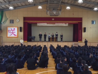 年度当初の集会はクラス分けと、担任発表ではらはらどきどきです。校長先生から横堤中学校10か条の話がありました。そのあと、先に示した通り新しく来られた先生方の紹介がありました。