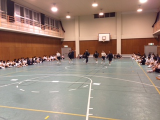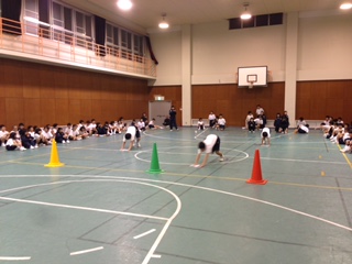 19:00より室内オリンピックの開催です。広い体育館でのびのびと活動しています。クラス一丸となって対戦します。チームワークが勝利のもとです。