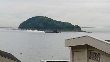 夕食の折に、館の外、海の入り江になんとビックリ!巨大な潜水艦が出現しました。日高の穏やかな海には似つかわしくない物体でした。私たちの知らなかったことですが、日本の海域では、色々な活動が行われているのですね。改めて知った光景でした。