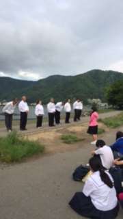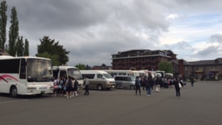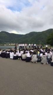 入村式で生徒代表挨拶のあと、先生からの諸注意を受け、自分たちだけでの宿舎生活を送ります。さあ、ペンションに向かってそれぞれのマイクロに乗り込みです。