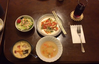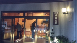 白富士荘の紹介です。河口湖畔にある旅館です、晴れていたら真正面に富士山が見えるようです。夕食はこれに後ステーキとメロン、ケーキが出ます。ゆったりとした施設で、のんびり友と語り合い、夜を過ごします。