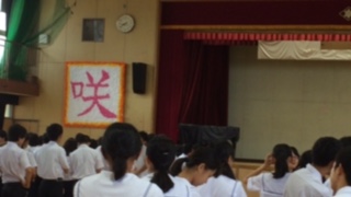 全校集会を行いました。体育館には昨年「友」今年度は「咲」の一文字が飾られています。毎年卒業式にその年の1年生が3年生に卒業を祝って贈っているものです。大事なパネルが落下よる修復で一時外されていました。想いを込め作り上げたもなので、大事にしていきたいと思います。