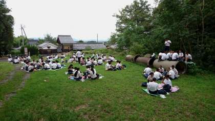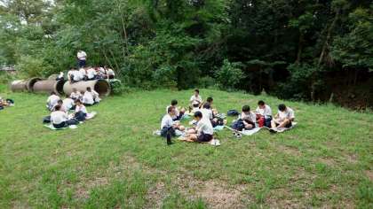 ハイキングの道中、広場で昼食です。