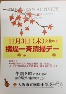 いつもは月末の日曜日に実施している地域と共に美化活動を、今回は「横堤一斉清掃デー」と銘打って、クリンーアップおおさかのとの協賛で、おおさかの街を綺麗にする運動にも参加しています。いつもにも増してご協力をお願いいたします。