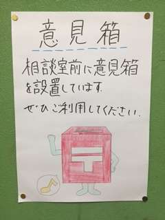 生徒会の取り組みで、意見箱の設置を相談室前にしています。学校の設備を整えてほしい。友だちと仲良くなれないんだけれどとうすればよいの?部活動での悩みなど学校生活を悩みなく送れるようにいろんな意見を待っています。活用してください。