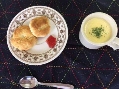 献立はスコーンとコーンスープです。