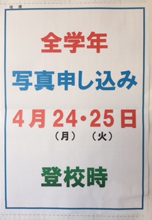 クラス写真の希望販売です。明日25日(日)までの2日間です。今日忘れた人は、登校時に申込み用封筒を提出をしてください。