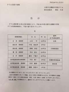 平成29年度横堤中学校PTA役員候補の告示をいたしました。役員候補は以下の通りです。 ○会長 山本学  ○副会長 中尾亜紀男・野崎由紀 ○書記 寺田直之 ○会計 廣田千嘉子 ○会計監査委員長 平田慎一 ○会計監査 松本優美・齋藤加奈子 以上告示期間は10日〜17日です。5月19日(金)19:30より総会にて選挙を行います。ご参加ください。