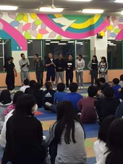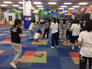 広いホールを有効に使い、ガチで工夫怒らしみんなが楽しめるスタンツを考えてくれています。いま、スタンツの一つのゲームの中で風船が大きな音を立てて割れました。キーキーキャーキャー歓声が上がる中で勝負が決まって行きます。みんなとても楽しそうです。