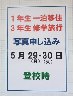 一泊移住・修学旅行の写真申し込みを行っています。明日、火曜日まで正門前で登校時間に申し込みをしています。希望者の販売です。必要な人は忘れず申し込みをしましょう。