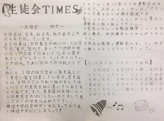 生徒会の通信「生徒会TIMES」が発行されました。生徒会の働き、意見箱、運動会、ペットボトルキャップとベルマーク回収などの話が載っています。ホームページ右「配布文書」にも載せています。ご覧ください。