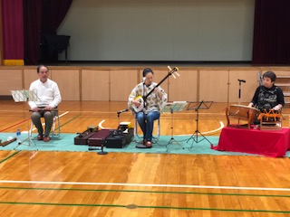 民衆の生活のなかで生れ育った歌。今はなぜか沖縄の三線(さんしん)のほうが馴染みある生徒が多く、こんな間近で民謡を聞くのは初めてという生徒もいました。日本文化の三線継承を大事にできた1時間でした。