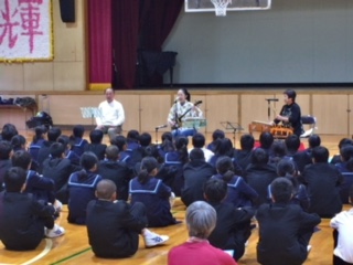一年生で民謡教室を行いました。三味線、尺八、和太鼓で日本ならではの謡いを聞くことができました。